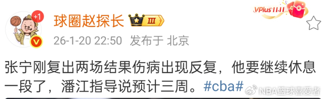 险胜辽宁男篮的比赛后,潘江介绍了张宁的伤病情况,由于拉伤出场了反复,张宁需要休息三周的时间,由于随后会进入窗口期,张宁有一个比较长的时间进行康复。